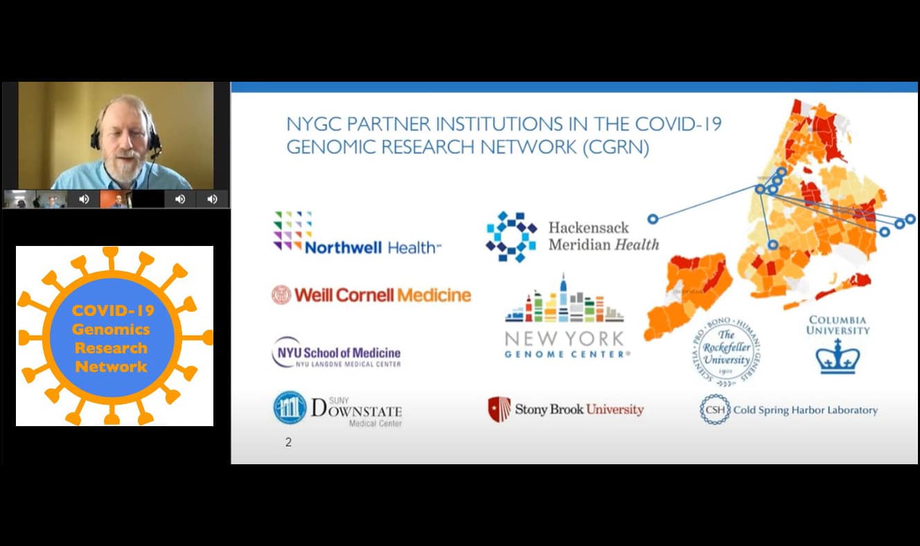 As part of his presentation, Dr. Zody detailed the sequencing/data sharing activities of the COVID-19 Genomics Research Network (CGRN), the multi-disciplinary research consortium formed by NYGC Evnin Family Scientific Director and CEO Tom Maniatis, PhD, in March 2020. This partnership includes hospitals and academic centers in the New York/New Jersey region sending biospecimen samples from COVID-19 patients to the NYGC’s Research Sequencing Laboratory for sequencing and analysis. This data, de-identified to protect personal health information of patients, is returned to the partner institution, shared with city and state agencies, and uploaded to open-source research community databases. Dr. Zody also shared findings from two studies led by CGRN partner Hackensack Meridian Health, one focused on immunocompromised COVID patients and another on assessing post-vaccination infection breakthroughs.